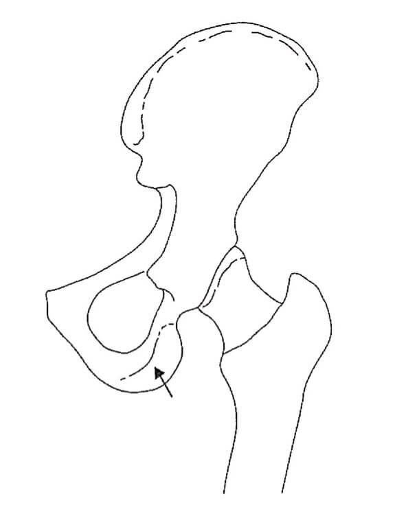 矢印の部分は、「坐骨結節」である。坐骨結節から付着する筋は、大腿二頭筋、半腱様筋、半膜様筋、下双子筋、大腿方形筋、大内転筋である。