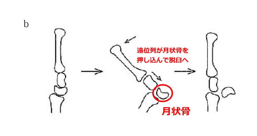Ⅰ型:月状骨は本来の位置に残り、遠位列が背側に脱臼(月状骨周囲脱臼)