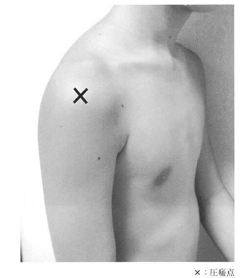 4.× 肩峰骨折では、圧痛部位がより肩峰の外上方(肩の最上部)にあるため、写真の部位とは異なる。