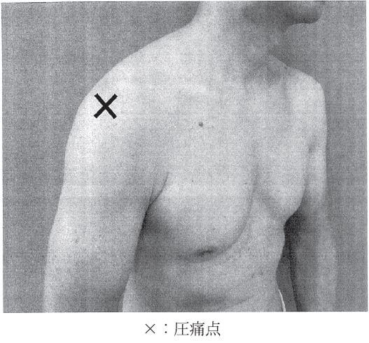 問題109.41歳男性。ソフトボール大会で送球した際に右肩に鋭い痛みを感じ負傷退場した。痛みは一時緩和したが、その後徐々に悪化してきた。下の写真に示す部位に圧痛が著しいが、腫脹はほとんど認められない。運動痛および外転制限が著明である。