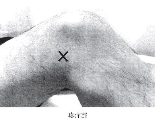 問題110.18歳の男子。3週間前から毎日ランニングをしている。最近、膝外側部痛が出現し来所した。徒手検査で膝関節の内反を強制しながら膝を伸展していくと疼痛が再現される。疼痛部の写真を下に示す。