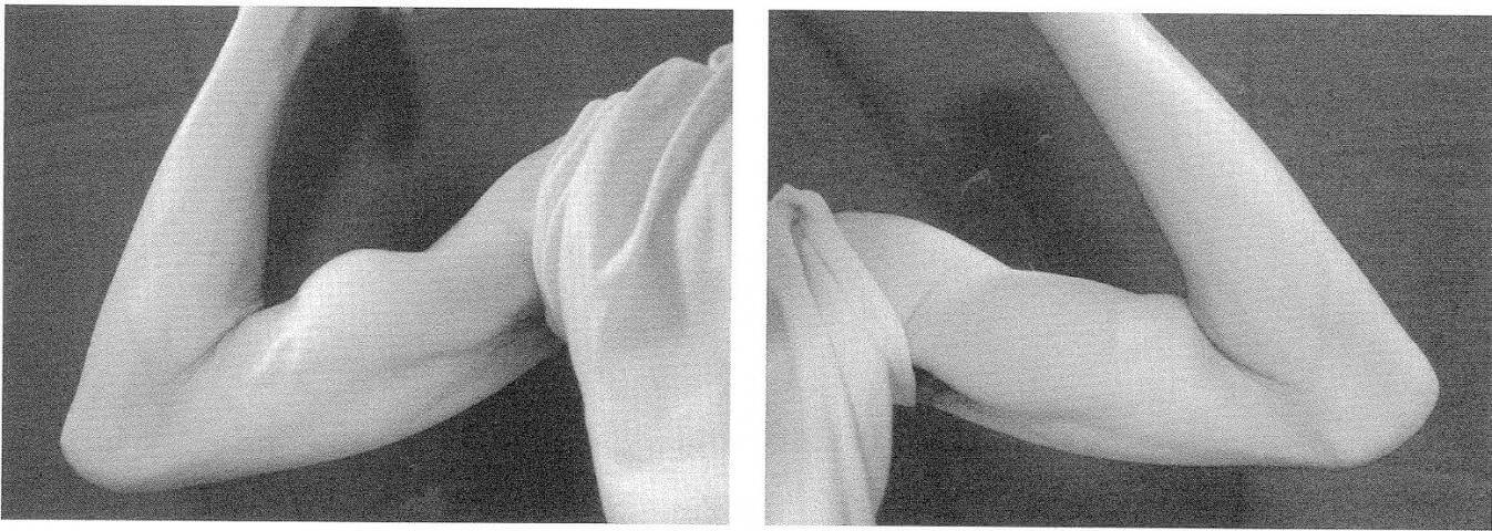 問題106.35歳の男性。倉庫で製品の管理をしている。昨日、約30kgの製品を持ち上げたとき、右上腕部にブチッという音と共に疼痛が出現したと訴え来所した。初検時に左右の肘関節を自動屈曲したときの外見写真を下に示す。