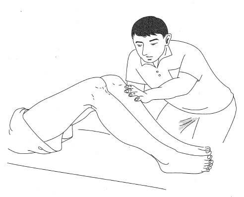 問題109.21歳の男性。2か月前、ラグビーの試合中に右膝前面を強打したが試合はそのまま出場した。それ以降、右膝に軽い腫れや違和感があった。1週前から練習中に右膝後方に痛みが出現し、不安定感も出てきたので来所した。初検時、検者は患者を背臥位とし、図のような評価を行った。